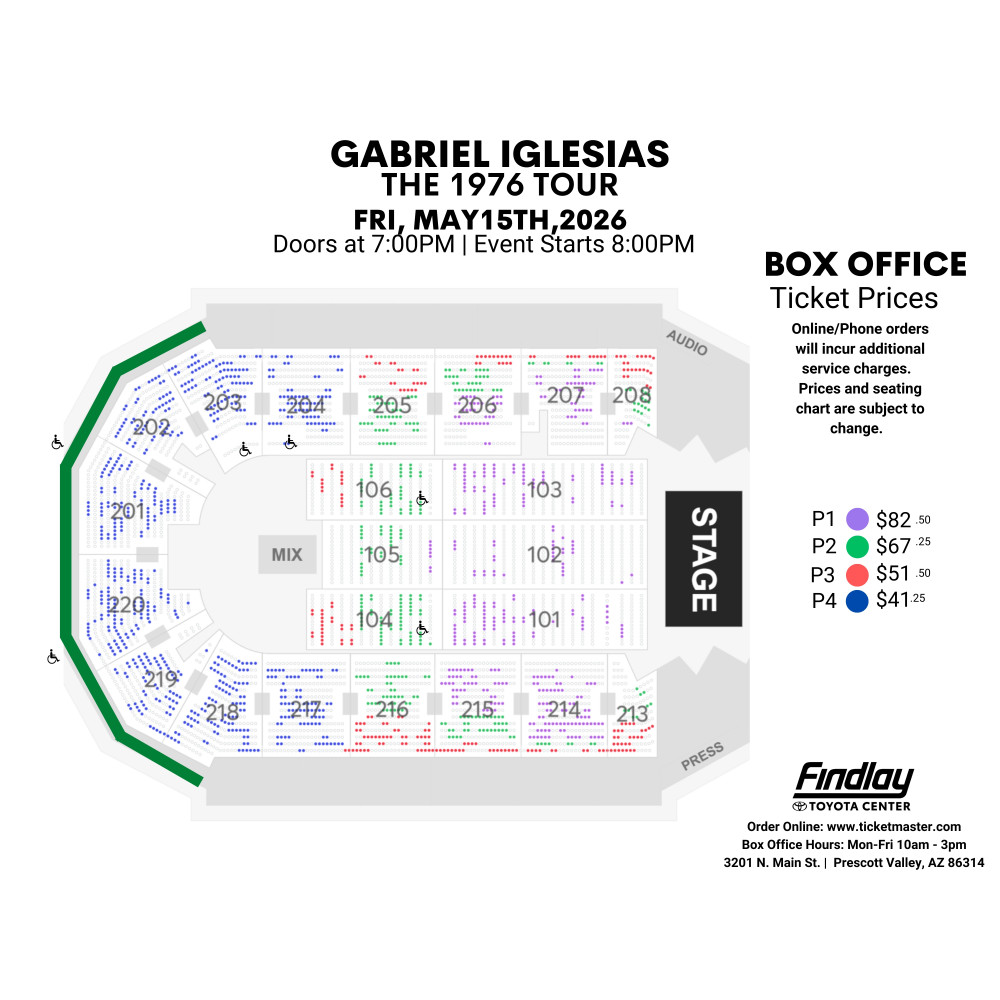 Arena Box Office: Monday – Friday 10 am – 3 pm | Online: www.ticketmaster.com | By Phone: 928-772-1819 ext 6060