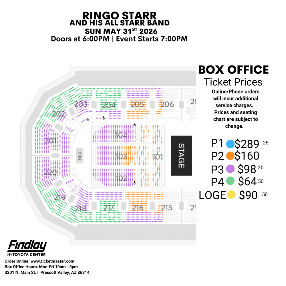 Arena Box Office: Monday – Friday 10 am – 3 pm | Online: www.ticketmaster.com | By Phone: 928-772-1819 ext 6060